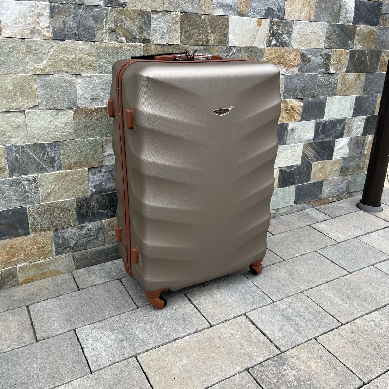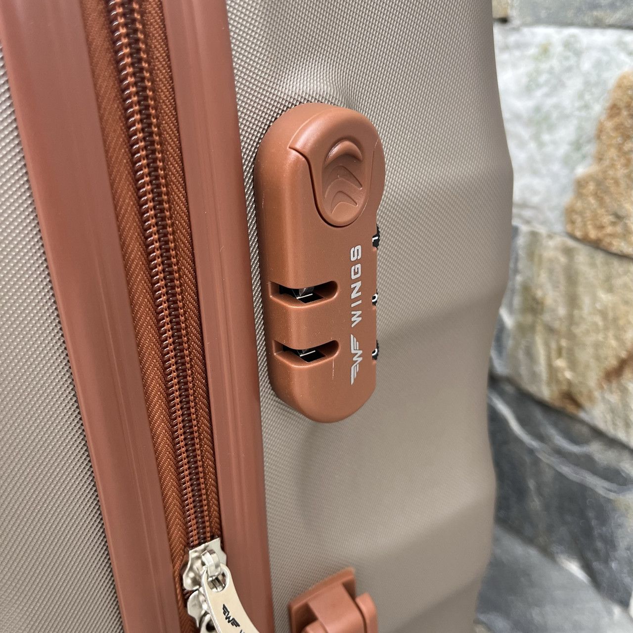 Розкішний валізу відомої компанії WINGS для самих вимогливих клієнтів. Сучасна, легка модель з дуже міцного і стійкого до подряпин пластику ABS Plus з дворівневою телескопічною ручкою. Зовнішні, приємні на дотик прогумовані ручки і кодовий замок для запобігання несанкціонованого доступу. У валізу вбудований міцний дюралюмінієва каркас. Оснащений чотирма поворотними гумовими колесами , що забезпечують стійкість і легкість руху в кожному напрямку. Інтер'єр світлого кольору розділений блискавкою на дві функціональні камери.