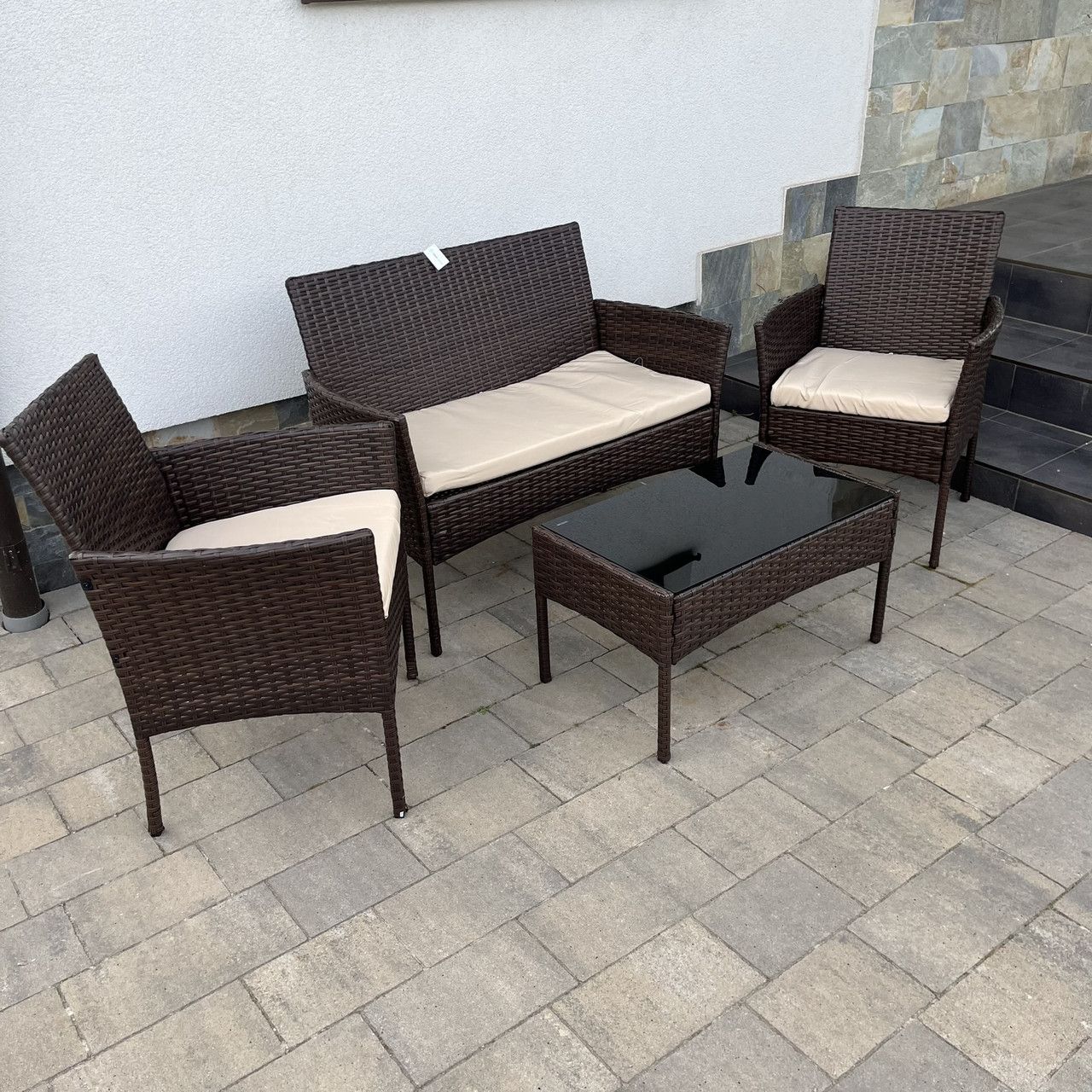 Комплект состоит из дивана, двух кресел и столика (подушки в комплекте)