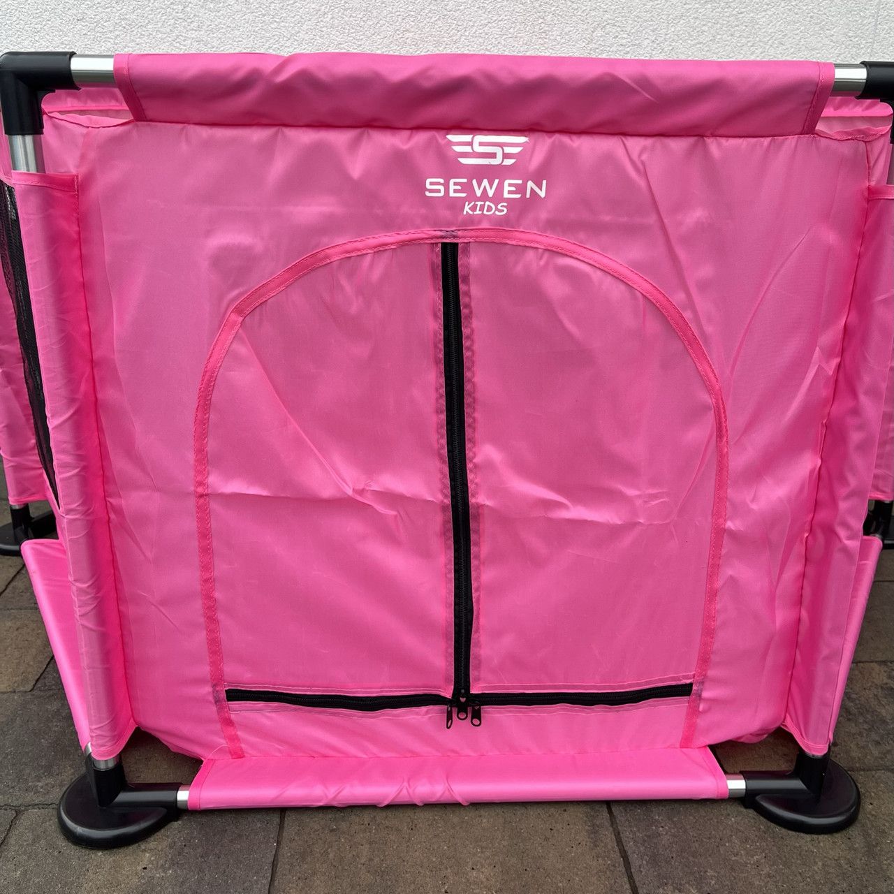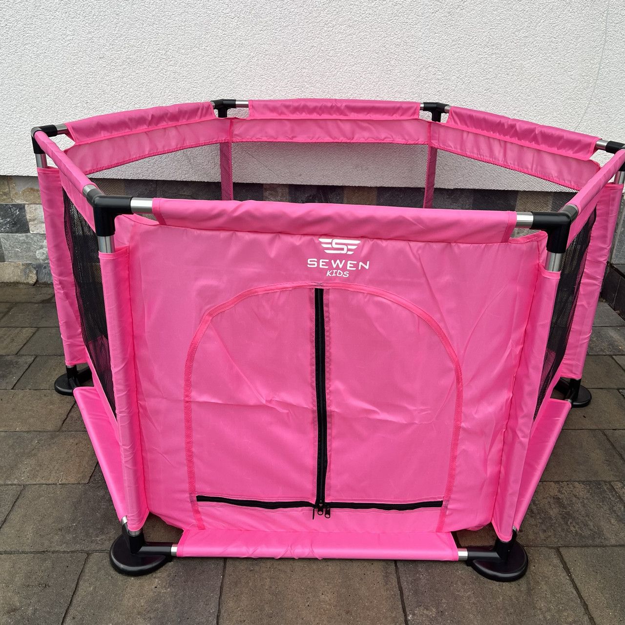 Манеж изготовлен из прочной ткани в сочетании с нержавеющей сталью, можно использовать долгие годы. Трубки из нержавеющей стали в сочетании с большими подставками обеспечат устойчивость ручки. С 5 сторон имеется сетка, которая позволяет наблюдать за происходящим внутри, а также обеспечивает адекватную циркуляцию воздуха. Манеж имеет вход на тройную молнию для удобного входа и выхода.
