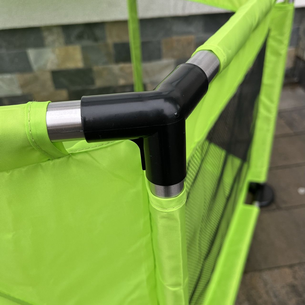 Манеж изготовлен из прочной ткани в сочетании с нержавеющей сталью, можно использовать долгие годы. Трубки из нержавеющей стали в сочетании с большими подставками обеспечат устойчивость ручки. С 5 сторон имеется сетка, которая позволяет наблюдать за происходящим внутри, а также обеспечивает адекватную циркуляцию воздуха. Манеж имеет вход на тройную молнию для удобного входа и выхода.