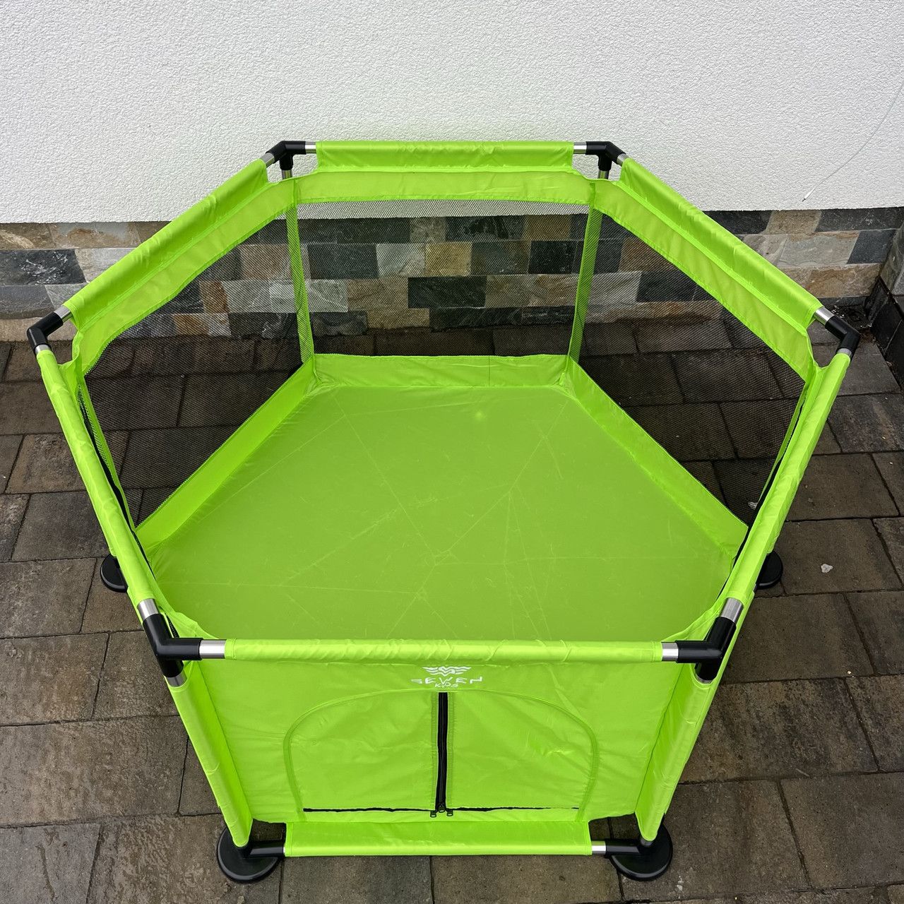 Манеж изготовлен из прочной ткани в сочетании с нержавеющей сталью, можно использовать долгие годы. Трубки из нержавеющей стали в сочетании с большими подставками обеспечат устойчивость ручки. С 5 сторон имеется сетка, которая позволяет наблюдать за происходящим внутри, а также обеспечивает адекватную циркуляцию воздуха. Манеж имеет вход на тройную молнию для удобного входа и выхода.