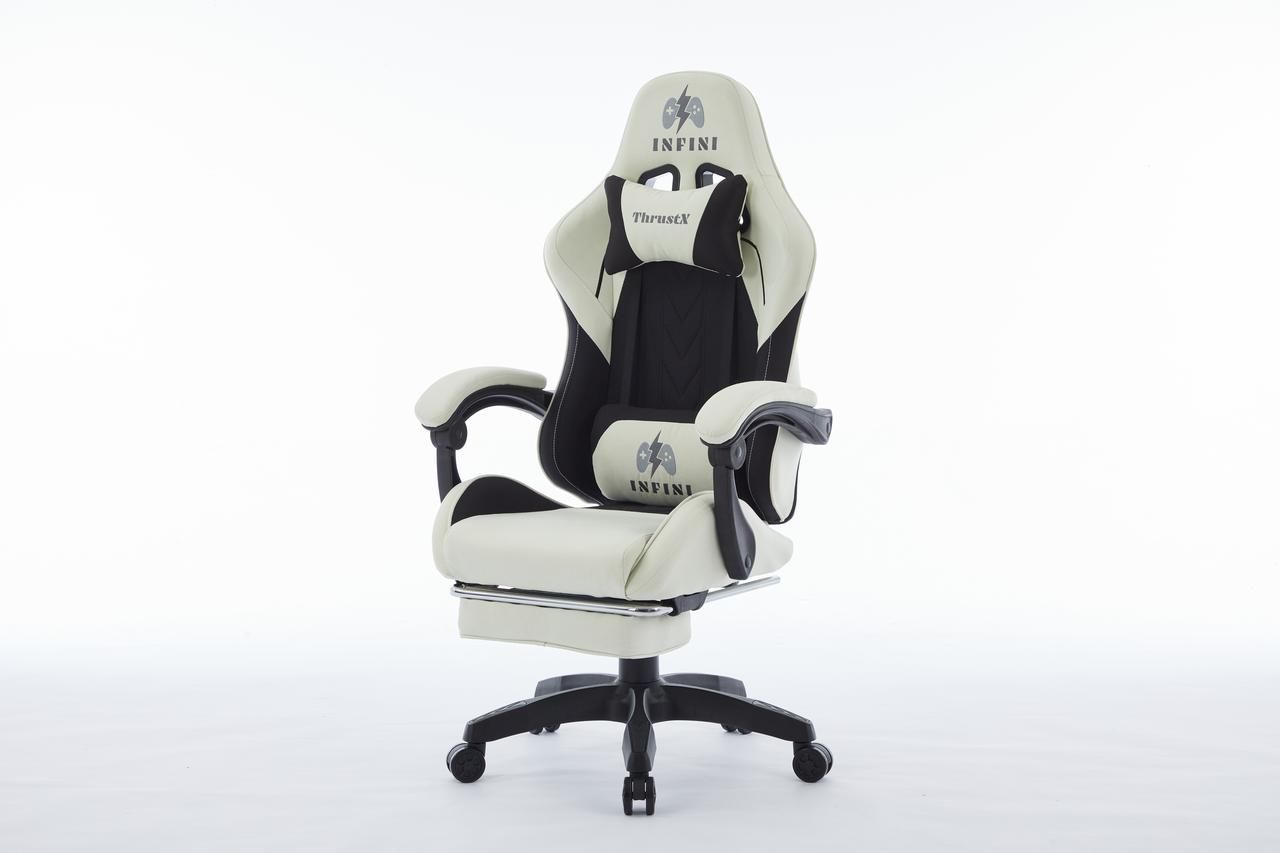 Ігрове крісло INFINI ThrustX - це зручне крісло, призначене насамперед для любителів комп'ютерних ігор. Дизайн крісла включає тканинну оббивку та висувну м'яку підставку для ніг. Крім того, стілець оснащений двома регульованими, знімними подушками, що дозволяє адаптувати його до індивідуальних уподобань користувача.
