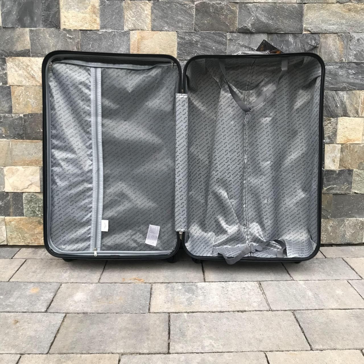 Розкішний чемодан від відомої компанії WINGS для найвимогливіших клієнтів. Сучасна і легка модель c дворівневою телескопічною ручкою виконана з міцного пластику ABS Plus зі стійкою до подряпин поверхнею. Зовнішні ручки валізи гумові та приємні на дотик. Кодовий замок запобігає проникненню небажаних гостей. У валізу вмонтована міцна дюралюмінієва рама. Кожна з валіз обладнана чотирма поворотними колесами, що забезпечують стабільність і легкість руху на будь-якій поверхні.