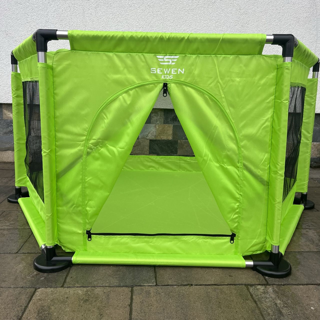 Манеж изготовлен из прочной ткани в сочетании с нержавеющей сталью, можно использовать долгие годы. Трубки из нержавеющей стали в сочетании с большими подставками обеспечат устойчивость ручки. С 5 сторон имеется сетка, которая позволяет наблюдать за происходящим внутри, а также обеспечивает адекватную циркуляцию воздуха. Манеж имеет вход на тройную молнию для удобного входа и выхода.