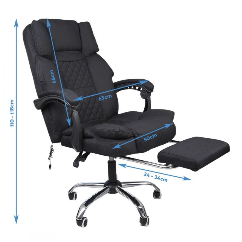 Офисное кресло MASTER КО32 ✓ УДОБНОСТЬ – удобные, широкие сиденья и спинка идеально подходят к силуэту сидящего человека. Высокий встроенный подголовник и подходящий профиль гарантируют функциональность и поддержку головы. Подлокотники правильной формы, что повышает комфорт использования, а также нагрузку на позвоночник. ✓ Выдвижная подставка для ног - дополнительно кресло имеет выдвижную подставку для ног, спрятанную под сиденьем, что обеспечивает комфорт использования и улучшает кровообращение в ногах. Правильное положение минимизирует усталость тела и устраняет мышечную боль, вызванную неправильным положением. ✓ РЕЗИНОВЫЕ КОЛЕСА - использование резиновых колес помогает предотвратить царапинам на полу, и порезам на ковре. Колеса делают пол безопасным, а перемещение на них тихое и комфортное. Пятизвездочная основа с двойными колесиками обеспечивает стабильное передвижение. ✓ РЕГУЛИРОВАНИЕ – кресло можно подстроить под индивидуальные потребности, благодаря чему мы получаем невероятный комфорт использования. Высота сиденья регулируется. Также регулируется угол наклона спинки (его можно зафиксировать в заданном положении). ✓ БЫСТРЫЙ И ЛЕГКИЙ МОНТАЖ – весь процесс складывания кресла быстрый, легкий и приятный. Это не должно занять более 10 минут. ХАРАКТЕРИСТИКИ: цвет: черный; материал: ткань; крестовина: хром; колеса: прорезиненные; размеры (длина/ширина/высота): 65/65/118 см; регулировка высоты кресла: 110-118 см; максимальная нагрузка: до 130 кг; вес кресла: 16 кг; вес с упаковкой: 17,8кг.