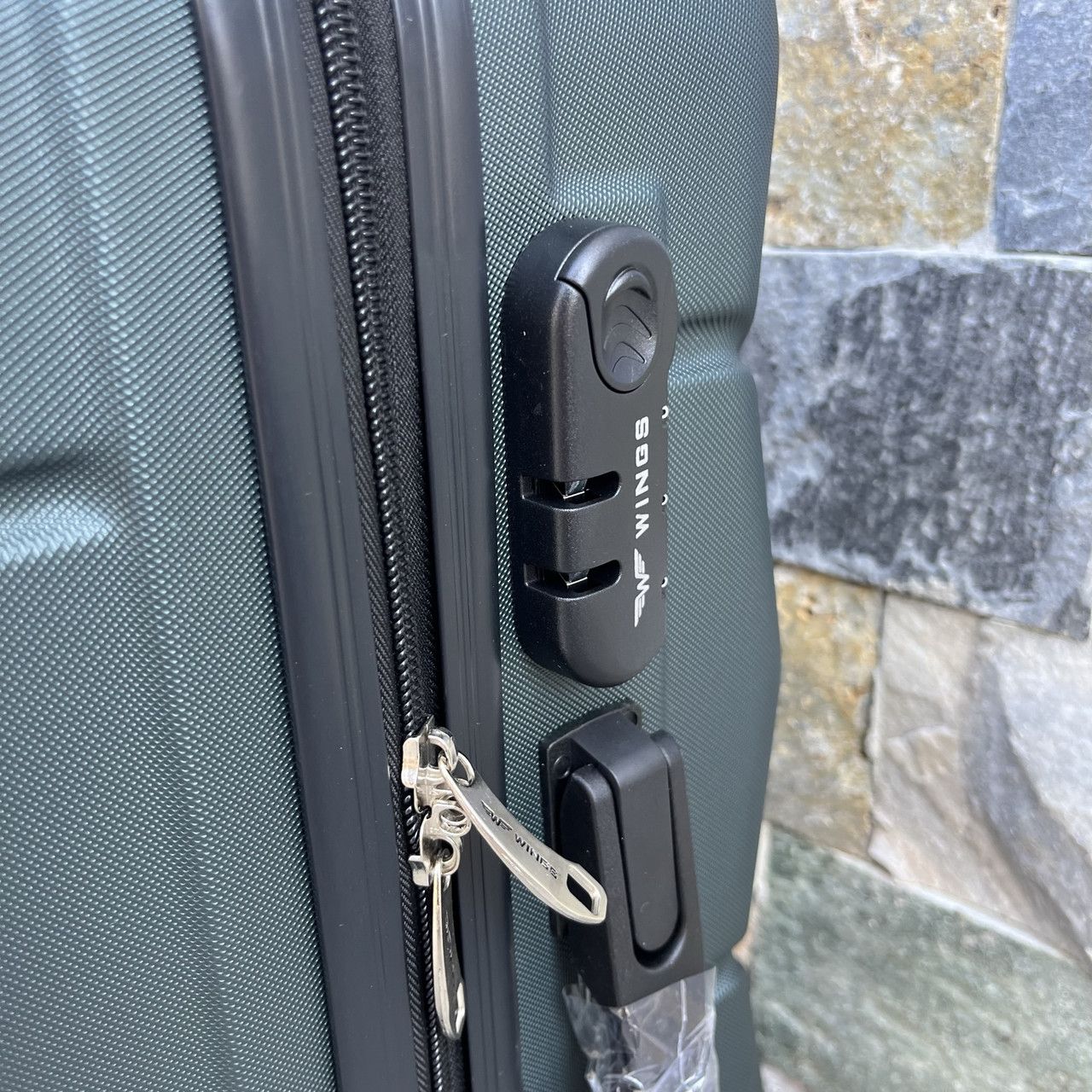 Розкішний чемодан від відомої компанії WINGS для найвимогливіших клієнтів. Сучасна і легка модель c дворівневою телескопічною ручкою виконана з міцного пластику ABS Plus зі стійкою до подряпин поверхнею. Зовнішні ручки валізи гумові та приємні на дотик. Кодовий замок запобігає проникненню небажаних гостей. У валізу вмонтована міцна дюралюмінієва рама. Кожна з валіз обладнана чотирма поворотними колесами, що забезпечують стабільність і легкість руху на будь-якій поверхні.